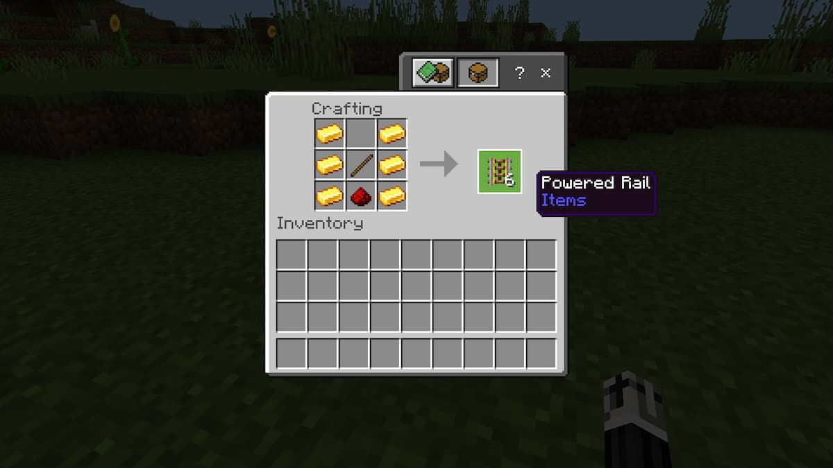 Przepis na crafting: Ułóż sztabki złota w dwóch rzędach po trzy na dolnej i górnej linii crafting table. W środkowym rzędzie umieść patyk pośrodku, a pod nim czerwony pył. Z takiego przepisu otrzymasz 6 torów zasilanych.